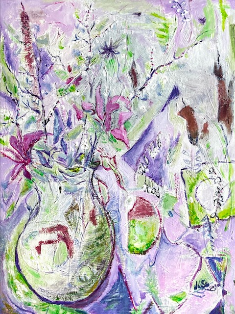 Jui-Lan’s love of gardening, museum-going and blind contour drawing are the bases for many of her paintings: paintings on flowers and gardens were inspired by her own garden. Jui-Lan’s recent mixed media “The hanging garden” was inspired by Suzanne Jackson’s “In Nature’s Way” at the Whitney Biennial 2024.