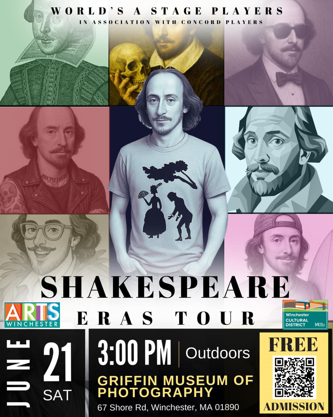The World's A Stage Players are proud to present the SHAKESPEARE ERAS TOUR, a journey through the people and places of twenty-four of Shakespeare's plays. Join them as they explore pieces from early comedy and high comedy, English history and Roman history, good love and bad love, and the classic tragedies and reflective romances...all in an afternoon!