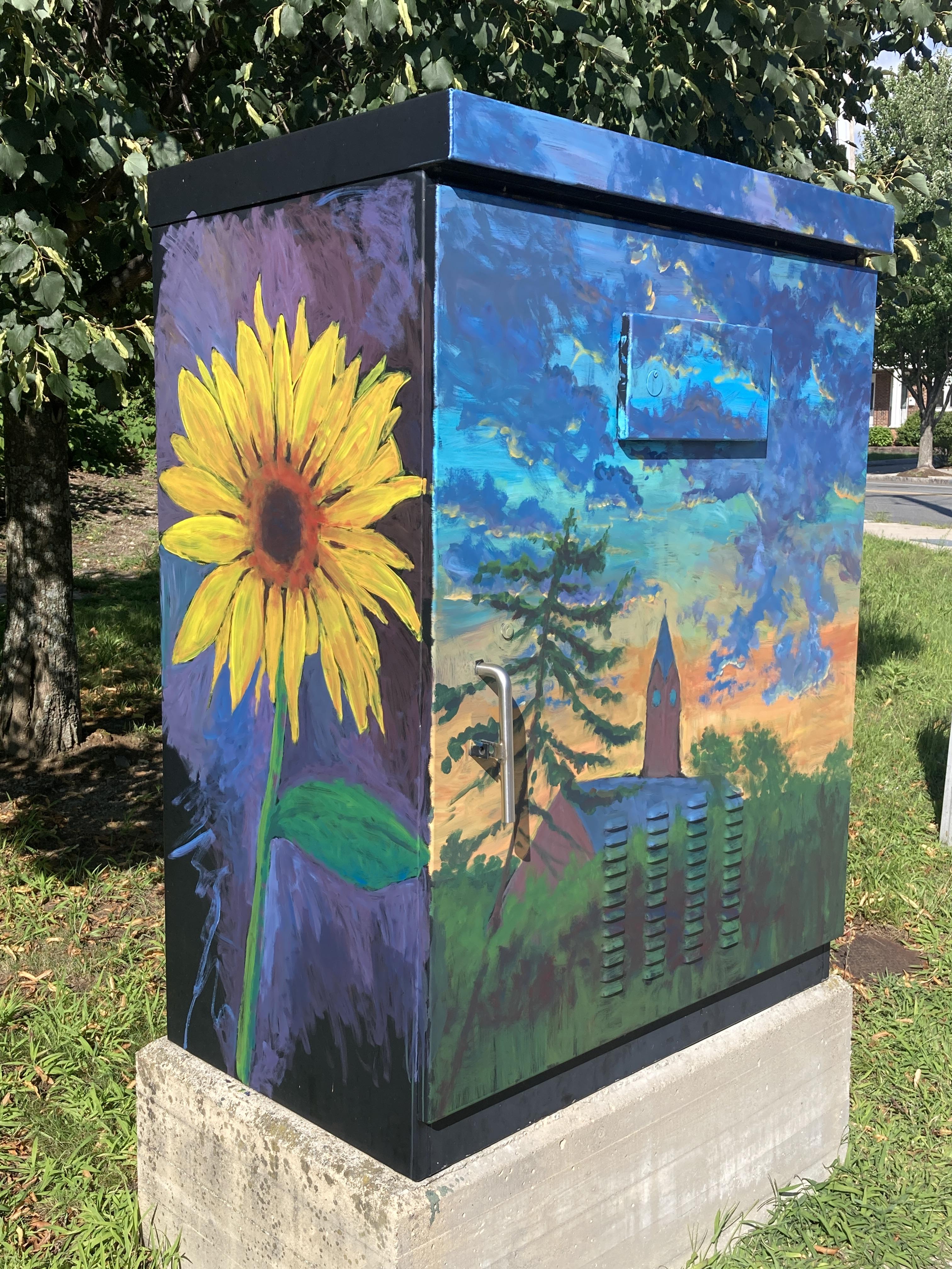 Adam Adkison painted the box at the corner of Skillings Road and Washington Street (across from the Jenks Center) with the silhouette of Town Hall outlined against a luminescent sky. The sides of the box feature painted flowers.