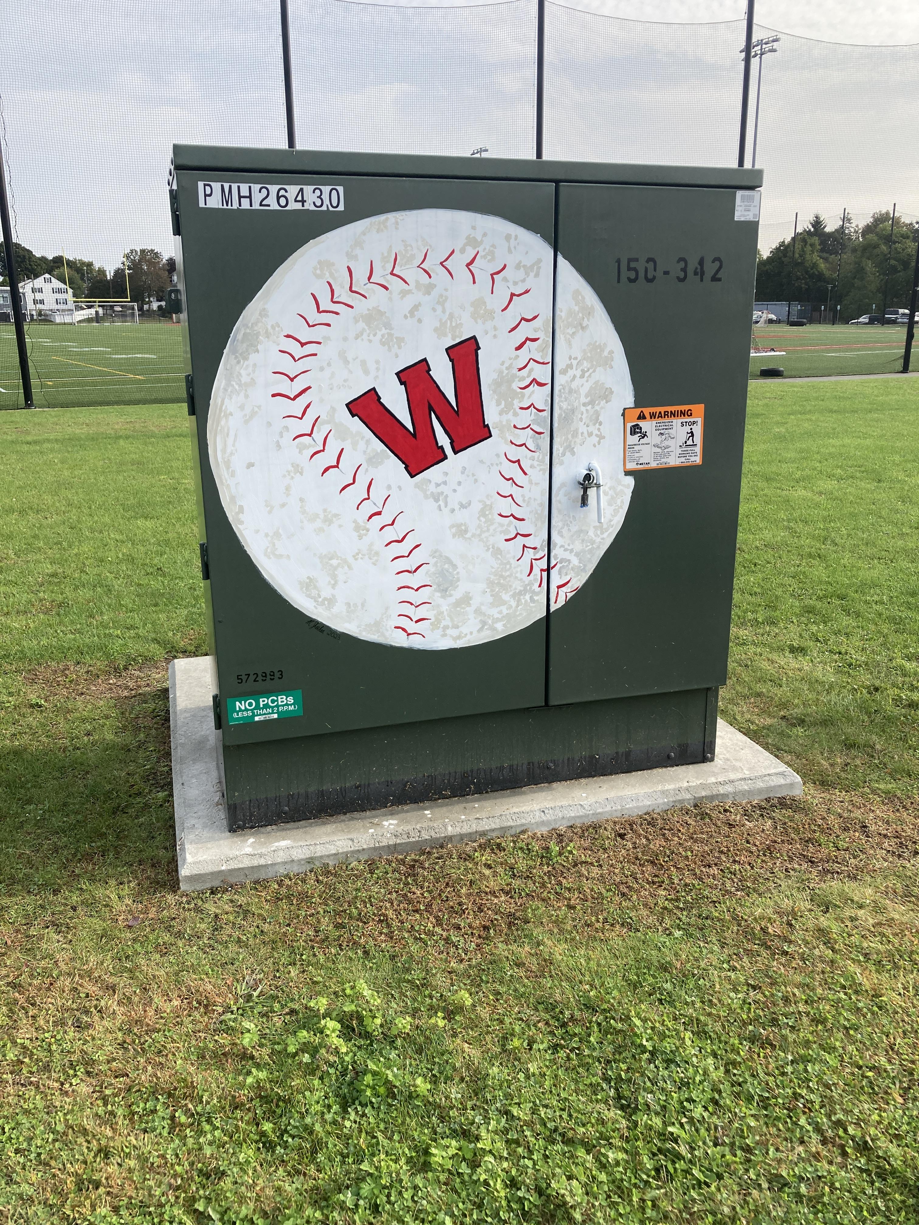 Meghan Sheehan painted two boxes. One, at the Skillings baseball field, has a baseball theme—a ball and “W” logo on one side and baseball players on the other sides.
