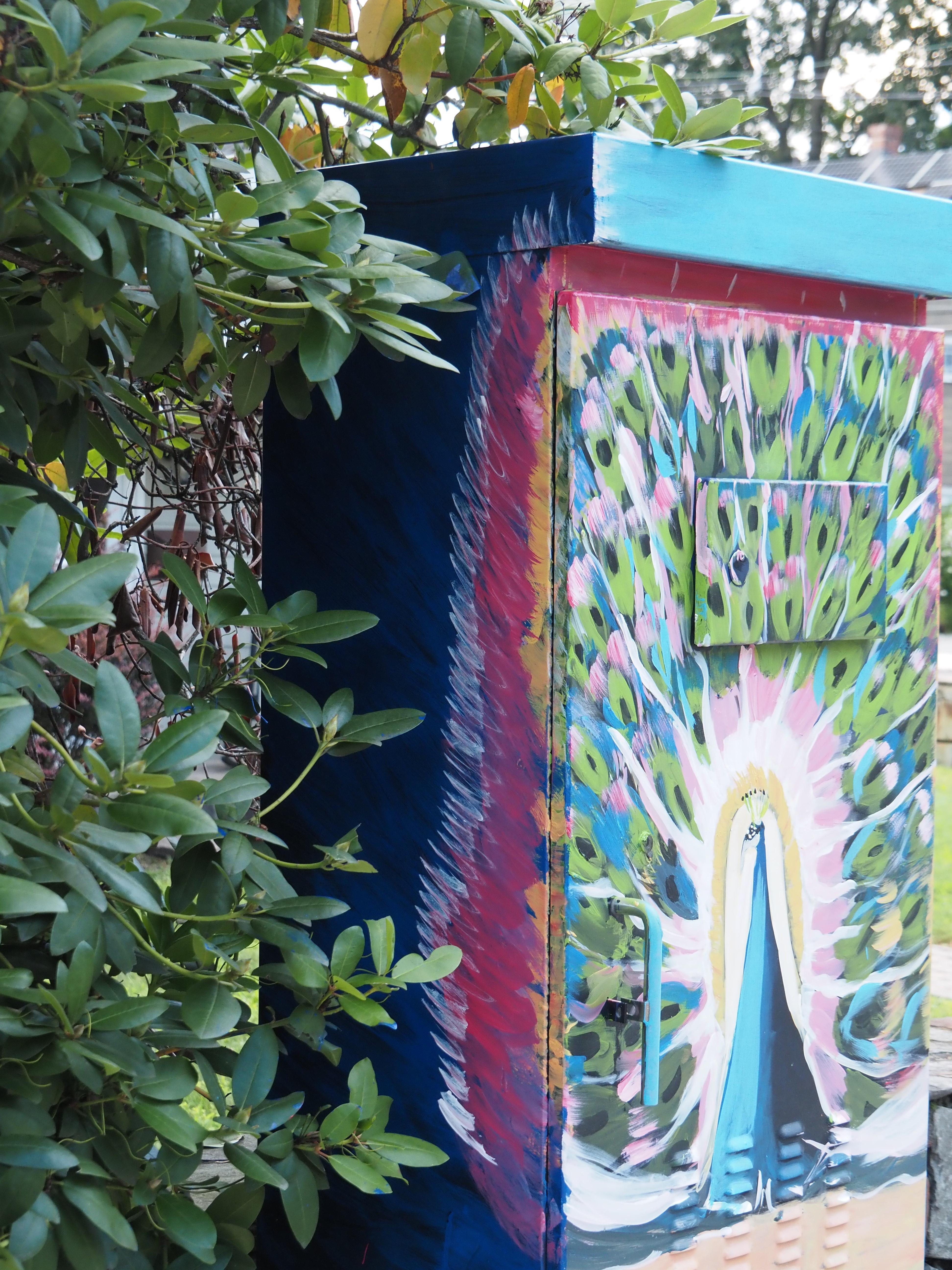 Lucia's second box, near Cross Street, is a colorful peacock.