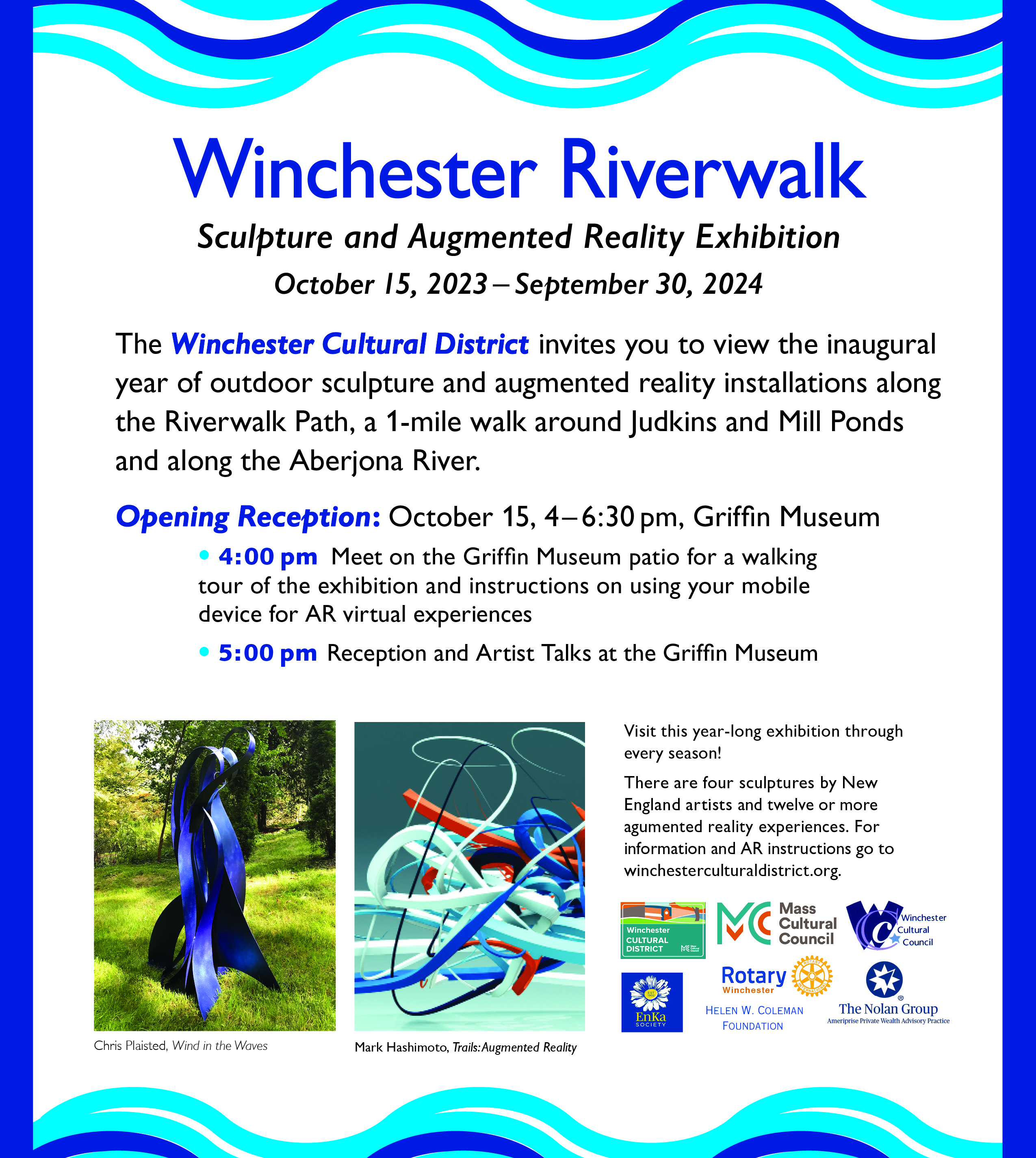 The Winchester Cultural District will open the first-ever “Riverwalk” exhibition on Sunday, October 15, 2023. The Opening Reception will be at the Griffin Museum from 4–6:30 p.m. All are invited!