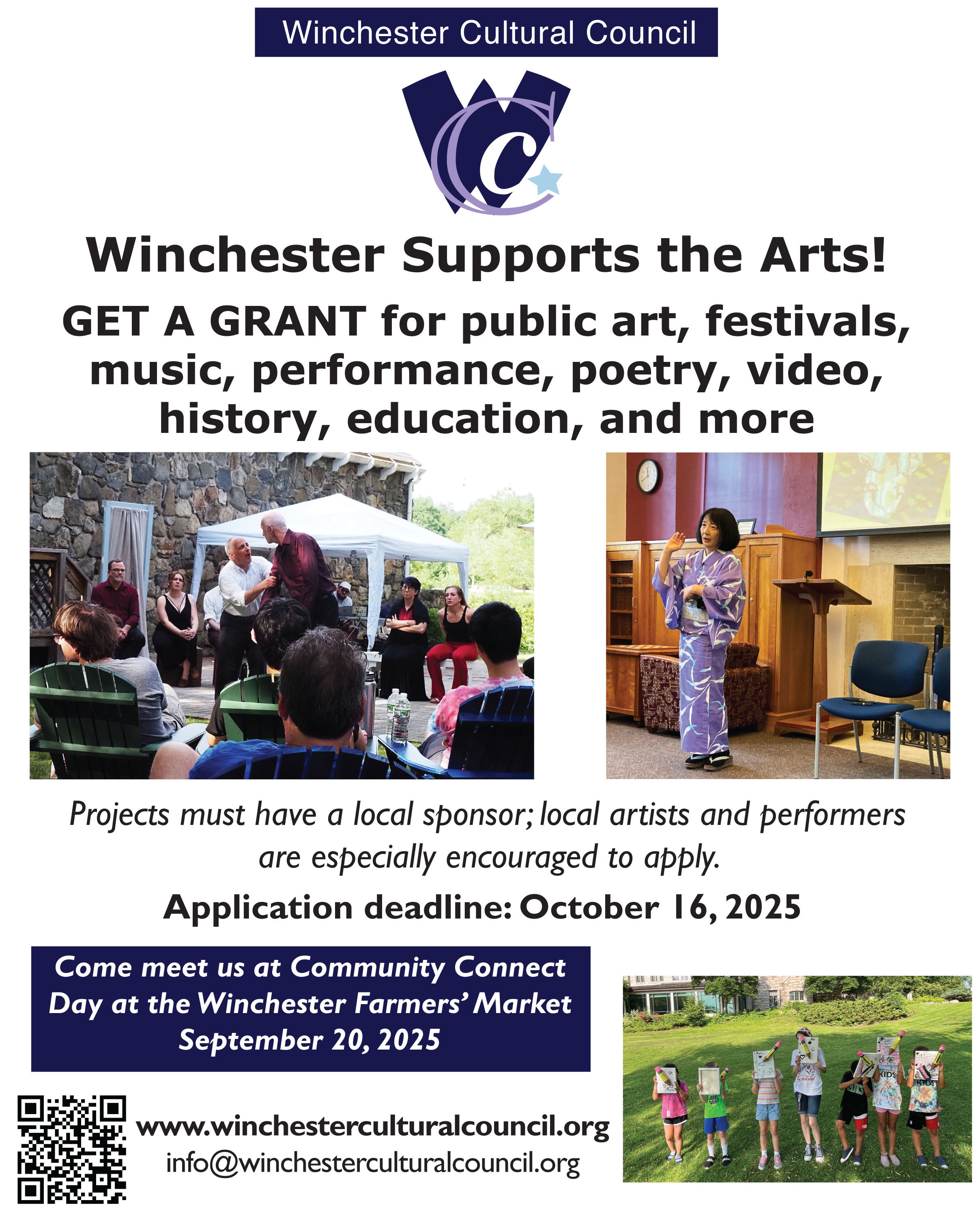 The Winchester Cultural Council grants program is continuing this year! Cultural activity is more important than ever in this stressful time, and it appears that our lawmakers will recognize that with grant funding levels similar to last year. The application deadline is November 16. The Cultural Council encourages everyone to consider applying for a grant. While the future is uncertain—many "traditional" projects (such as performances or in-person talks) might not be possible for a while—this could be an ideal time to try something new.