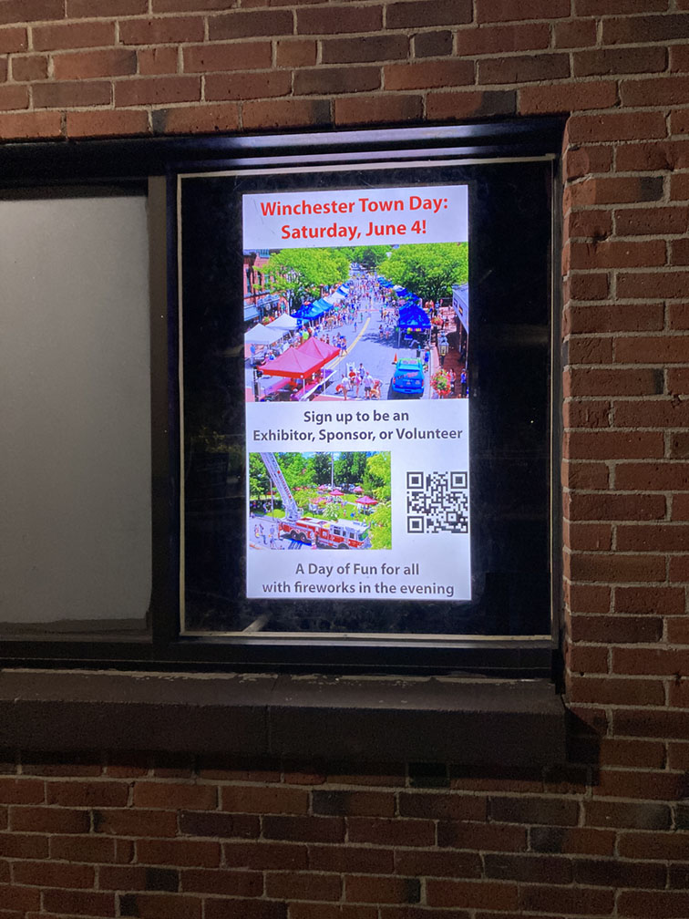 Organizations and individuals are welcome to submit an electronic flier with information of general public interest for posting on the video display. Just write to info@winchesterculturalcouncil.org. Fliers should be non-commercial in nature and may advertise an event or an opportunity for public involvement. There is no charge for display.